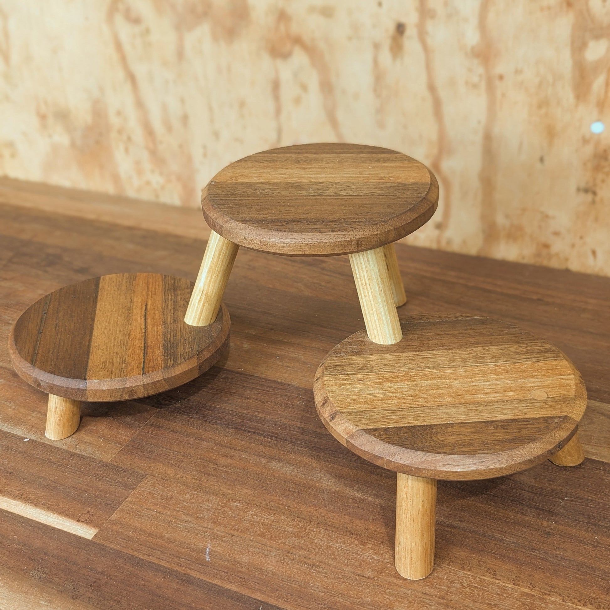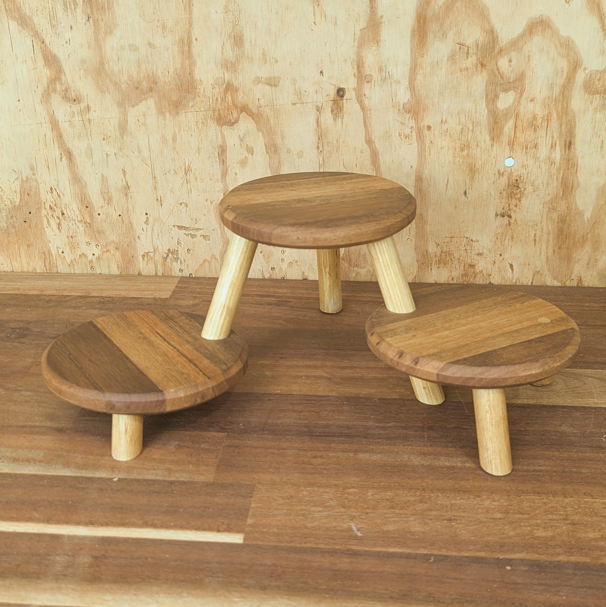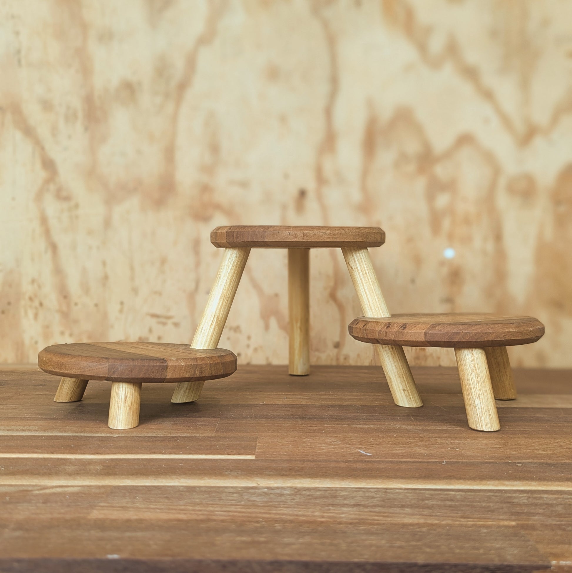 A small three tiered display ideal for indoor table top use, to display small house plants and decorative objects. This item has finished with a traditional Danish oil, which is made and owned in Australia and is manufactured in a sustainable method from environmentally friendly ingredients. The finish also cures hard once fully dried, and as such adds durability and brings out the timbers traditional patina with a warm finish.