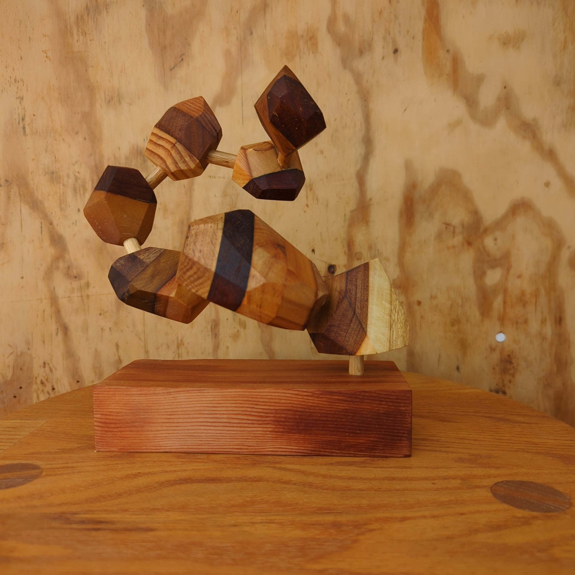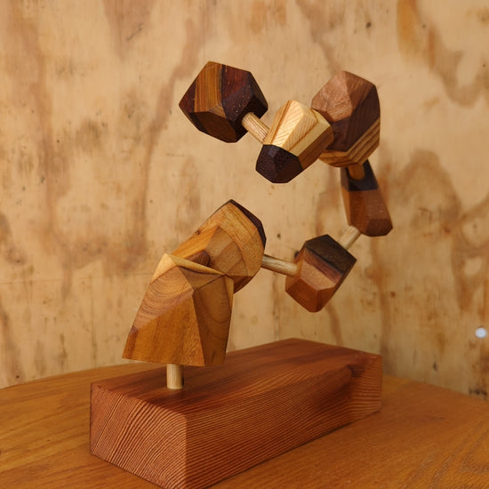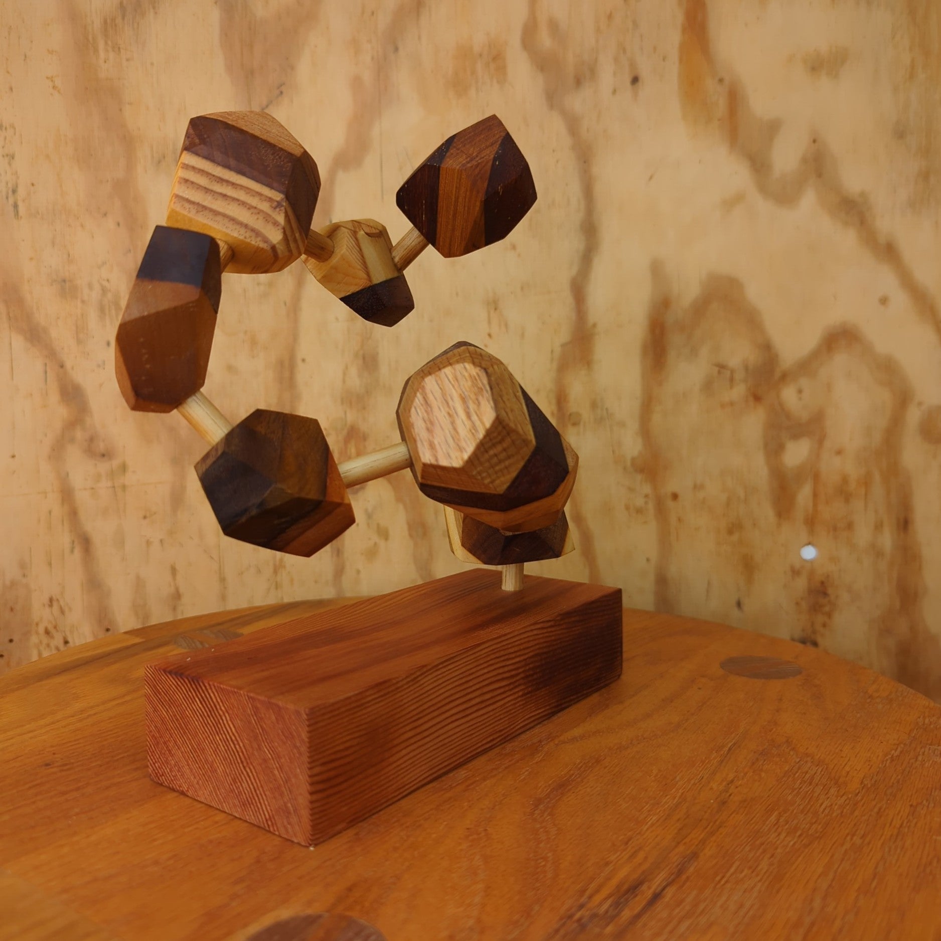 A one-of-a-kind statement piece, Orbit is handcrafted entirely from reclaimed wood — each segment shaped, sanded, and balanced by hand. The design captures a sense of motion and connection, with geometric forms suspended in graceful balance.