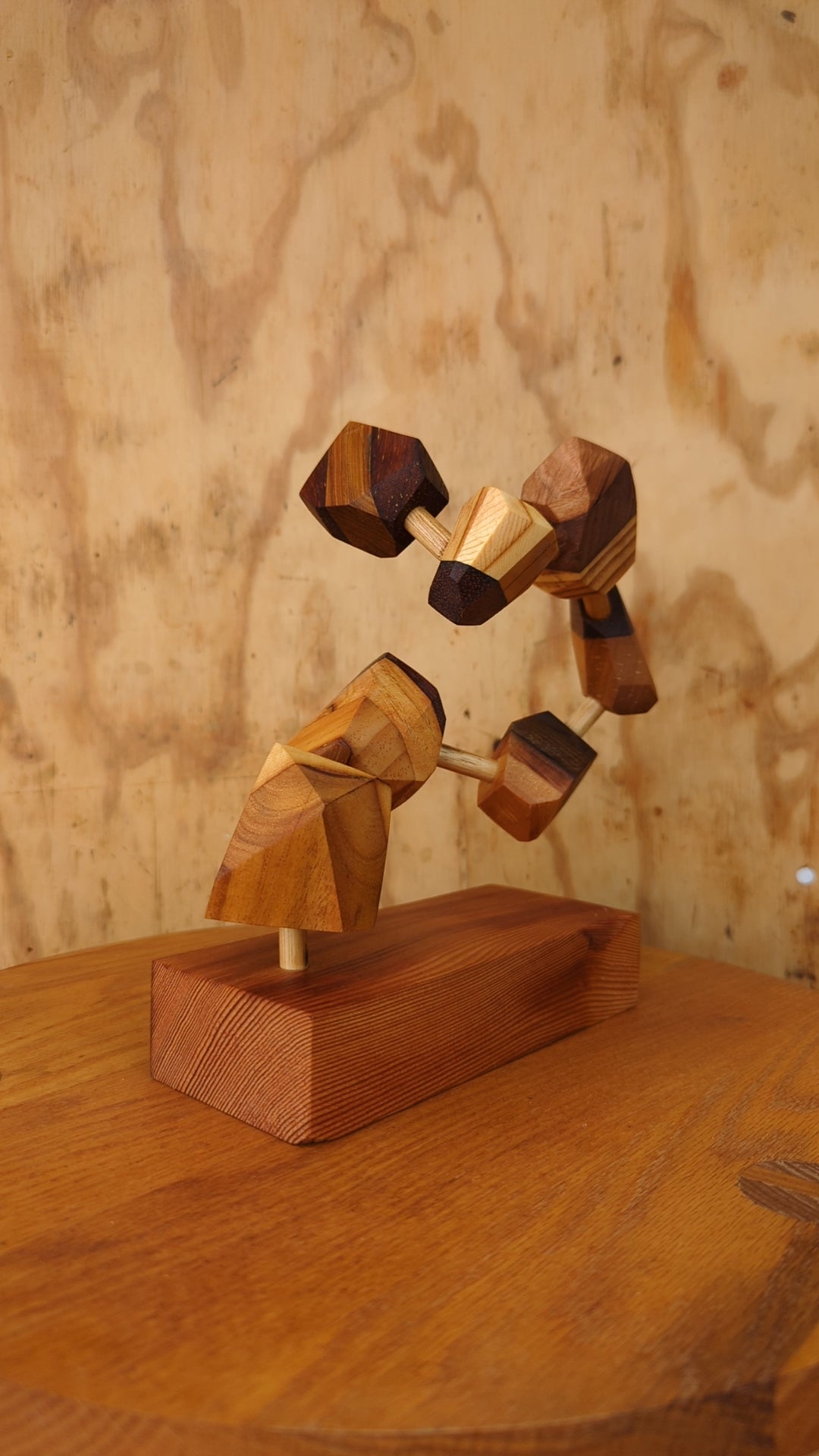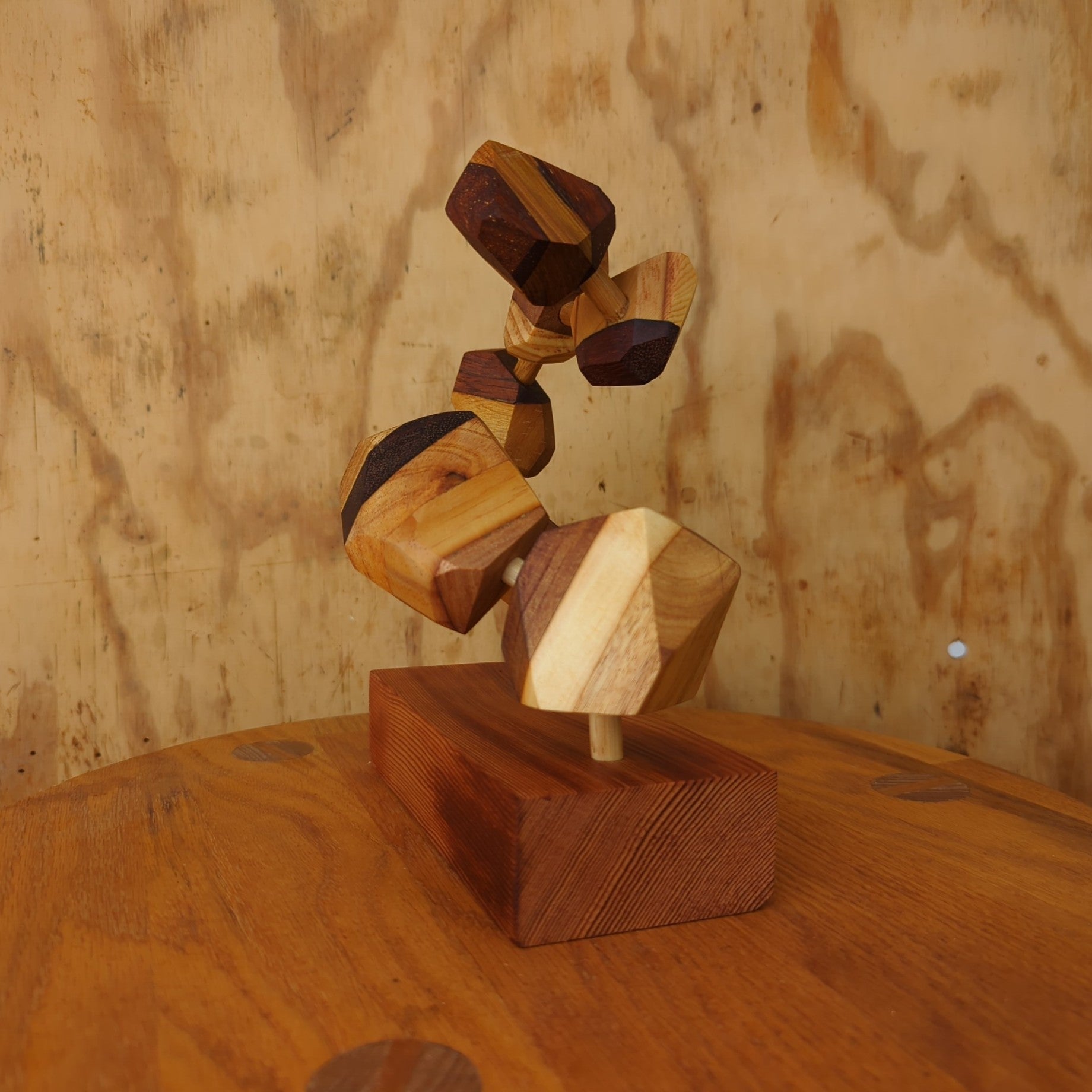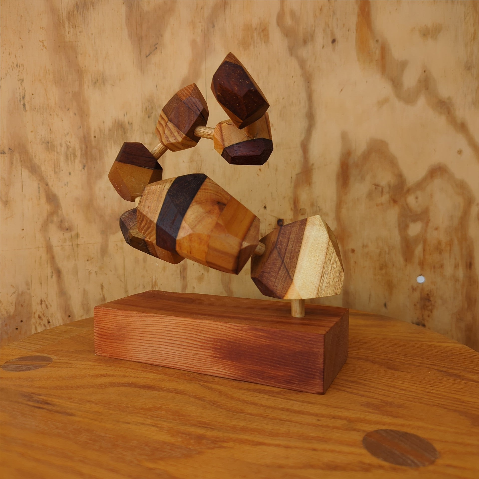 A one-of-a-kind statement piece, Orbit is handcrafted entirely from reclaimed wood — each segment shaped, sanded, and balanced by hand. The design captures a sense of motion and connection, with geometric forms suspended in graceful balance.