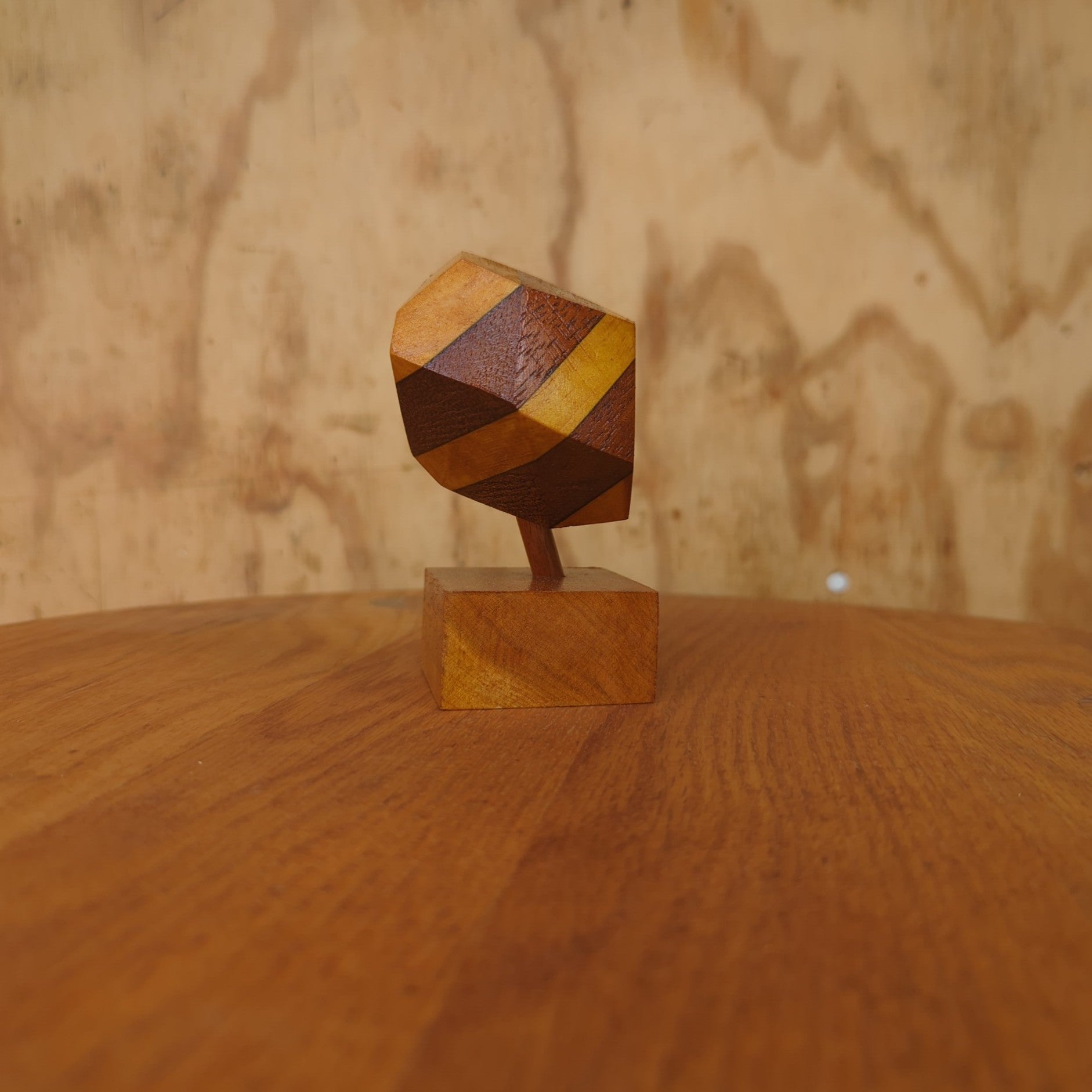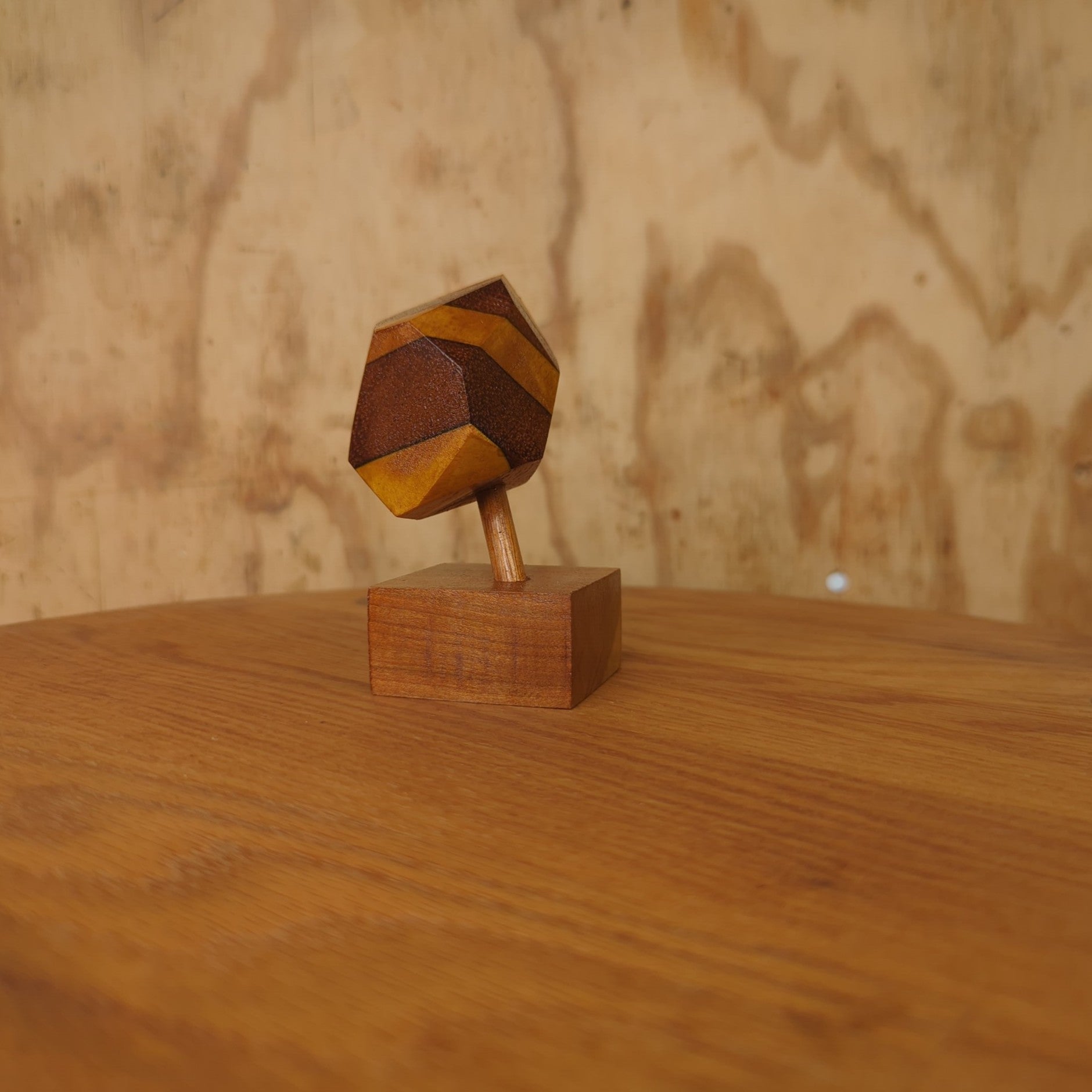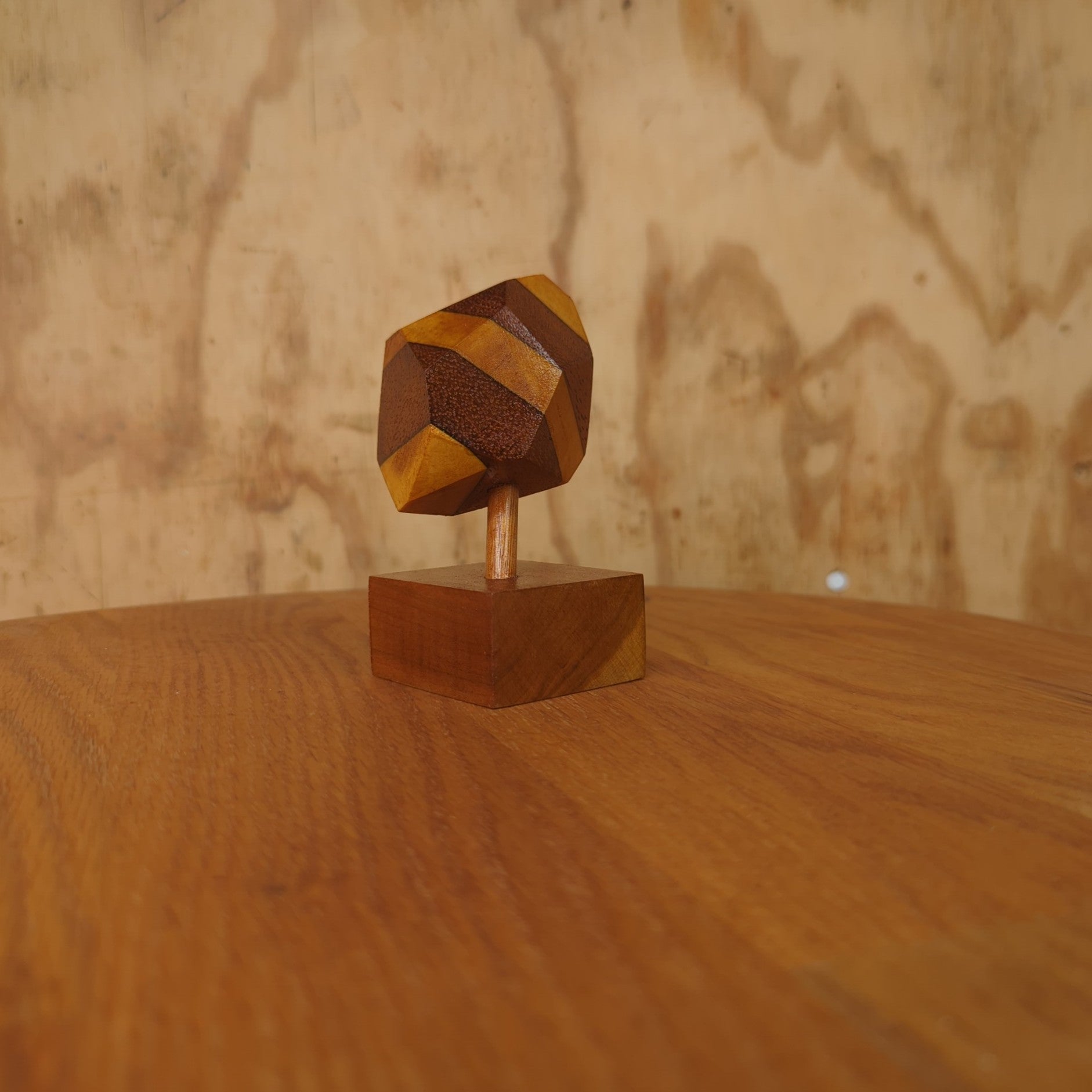 The faceted shape gives it a contemporary, minimalist look, while the warm wood tones add an earthy balance. Perfect as a desk accent, bookshelf display, or gift for anyone who loves sustainable, handcrafted decor.
