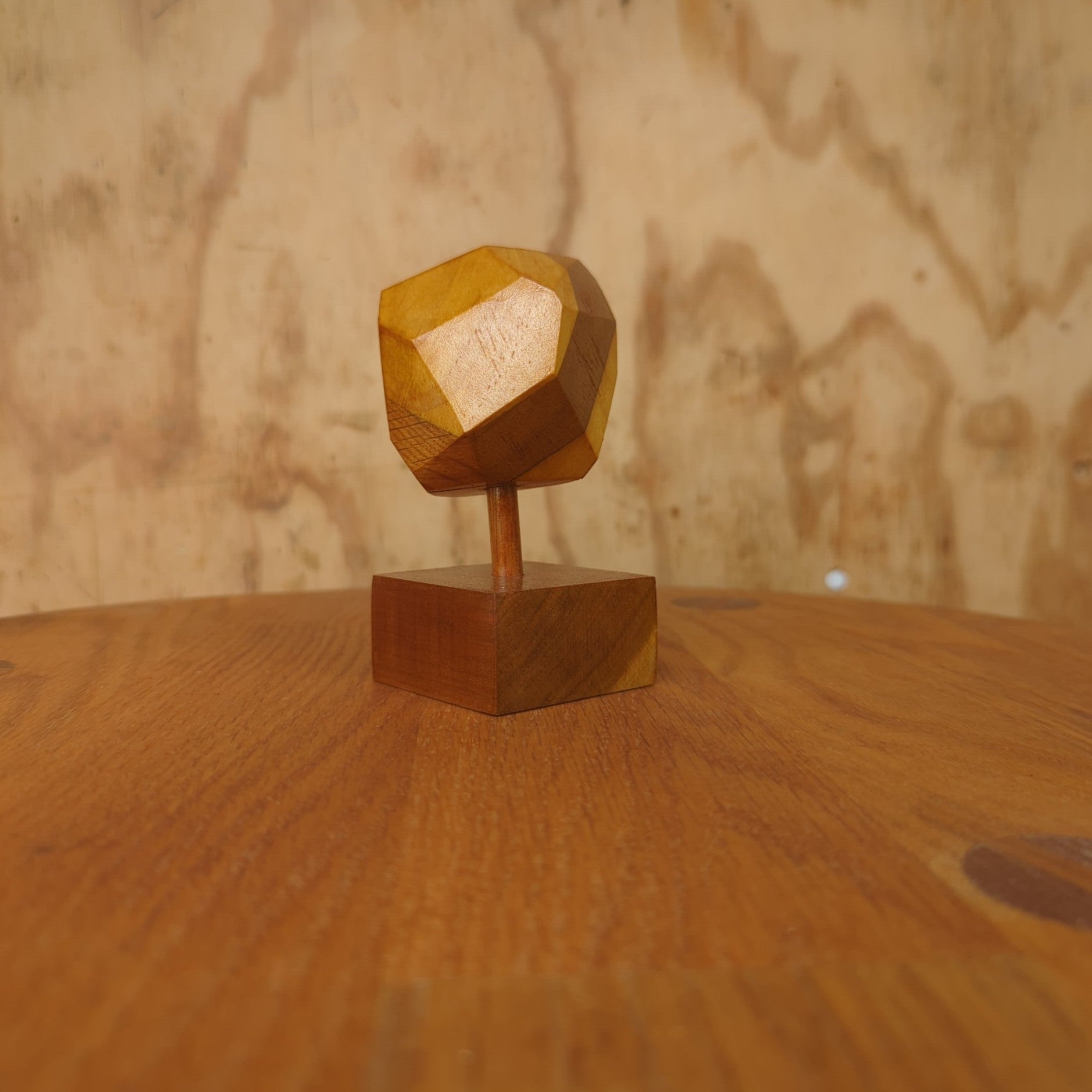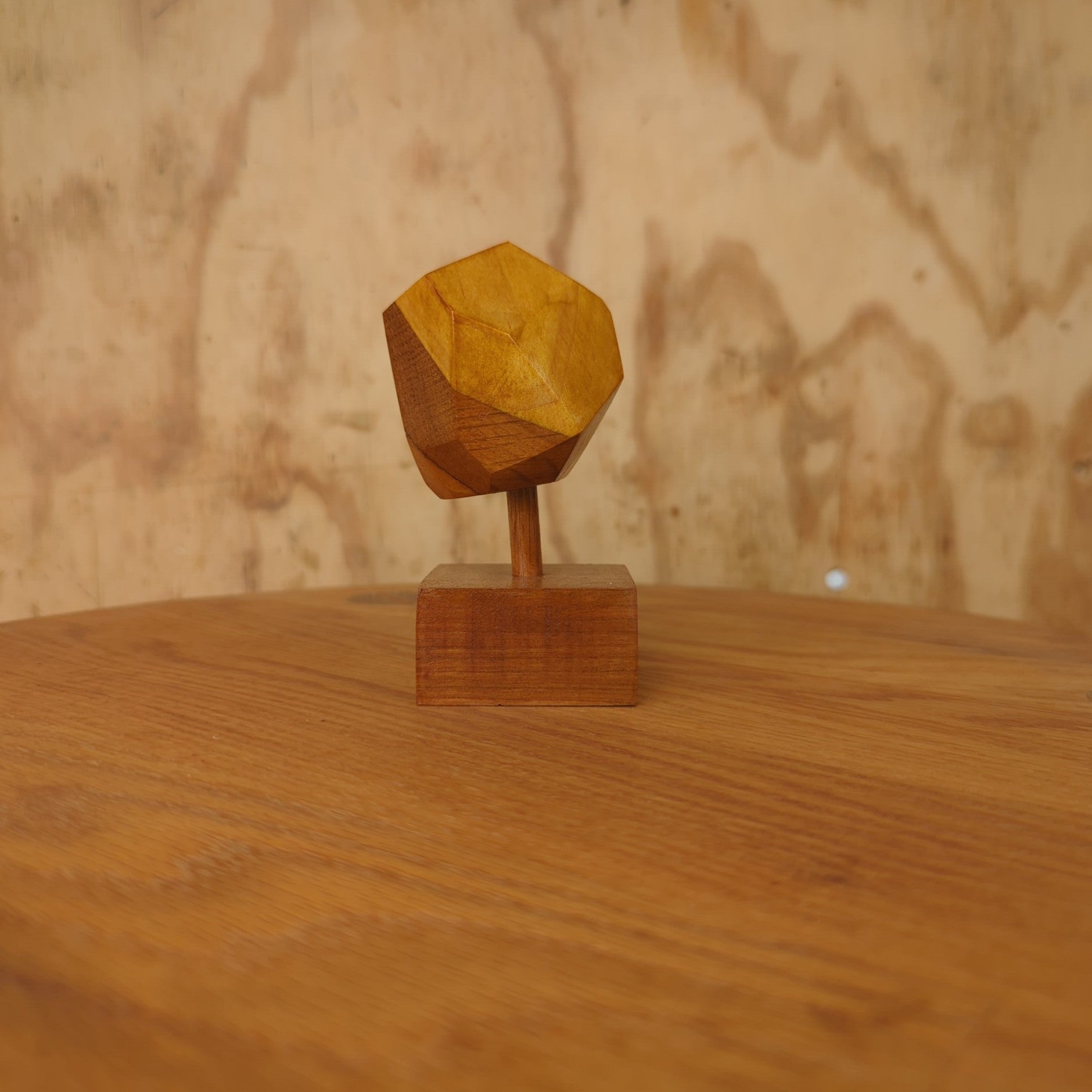 The faceted shape gives it a contemporary, minimalist look, while the warm wood tones add an earthy balance. Perfect as a desk accent, bookshelf display, or gift for anyone who loves sustainable, handcrafted decor.